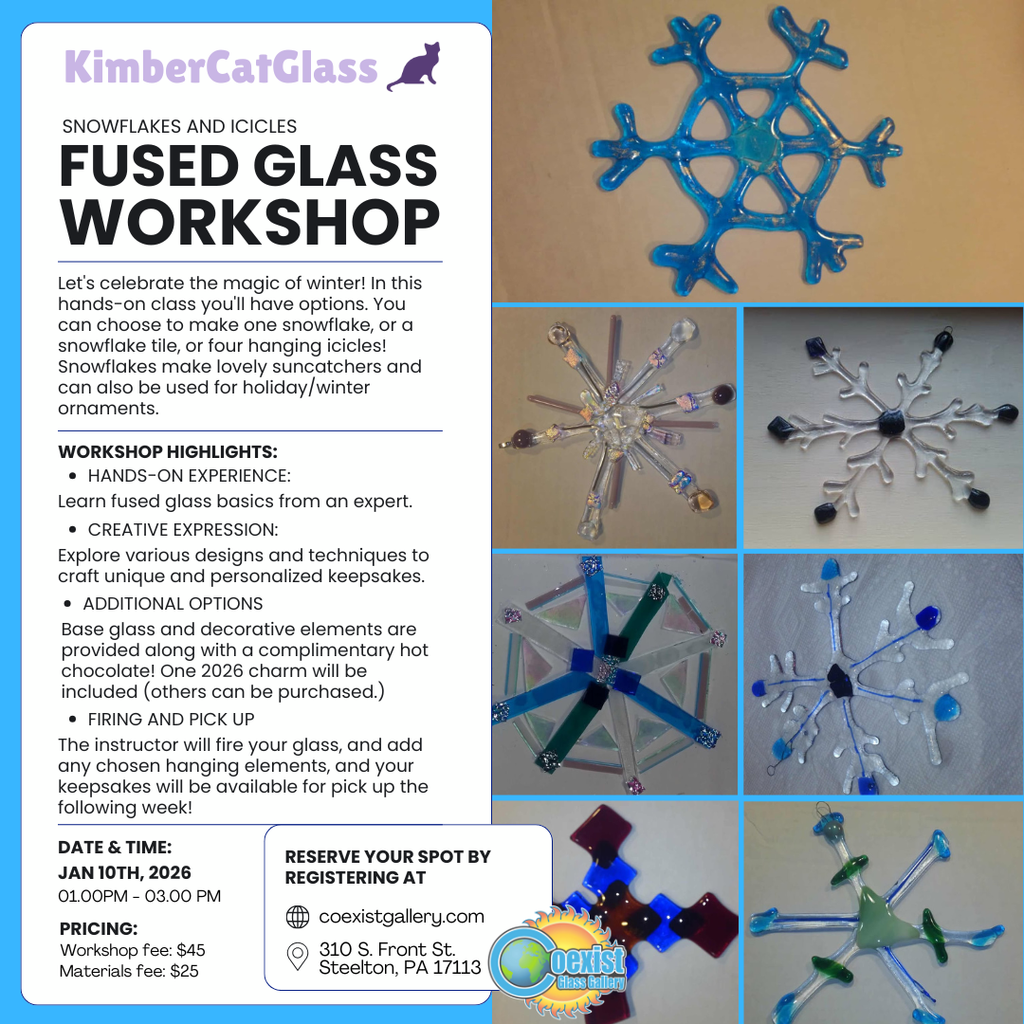 Let's celebrate the magic of winter! In this hands-on class you'll have options. You can choose to make one snowflake, or a snowflake tile, or four hanging icicles! Snowflakes make lovely suncatchers and can also be used for holiday/winter ornaments.