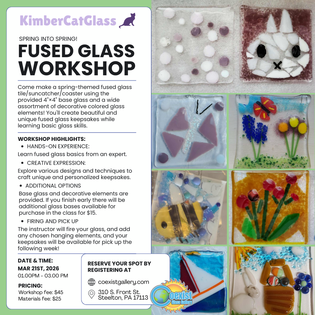Join us to make a spring-themed fused glass tile/suncatcher/coaster using the provided 4"×4" base glass and a wide assortment of compatible decorative colored glass elements including frit, stringers, dots, dichroic glass, and glass inclusions, as well as hangers if needed. You'll create beautiful and unique fused glass keepsakes while learning basic glass properties, cutting/shaping skills, and design principles. You can come with ideas for making a spring image/theme, an abstract design or geometric pattern, or be inspired once you arrive. You create and assemble your projects with your instructor helping you interpret and execute your vision.